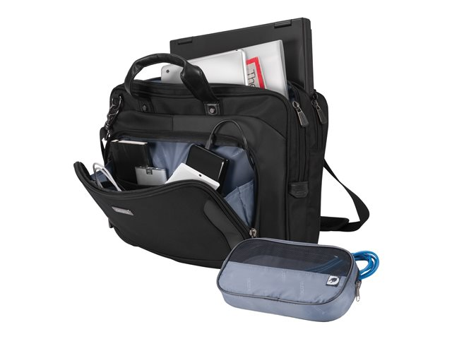 Dans le compartiment pour les documents, qui comporte des subdivisions pratiques, les documents importants peuvent être rangés en toute sécurité. Grâce à la pochette pour tablettes jusqu'à 10.1", qui est également tapissée de HDF, le PC mobile se transporte également en toute sécurité. Les pochettes pratiques et confortablement accessibles dans la poche frontale mettent de l'ordre dans vos objets personnels. Ainsi, vous avez les objets importants comme le smartphone, les cartes de visites ou les clés toujours à portée de main. Dans un étui amovible, le bloc d'alimentation et d'autres accessoires peuvent se ranger aisément - finis les enchevêtrements de câbles. Les poignées pratiques et une sangle d'épaule rembourrée assurent un bon confort de transport. Pendant les voyages avec plusieurs bagages, la sacoche se fixe, avec la sangle trolley pratique, à votre valise à roulettes en une seule manipulation. Ainsi, vous êtes paré au mieux pour tous les défis.