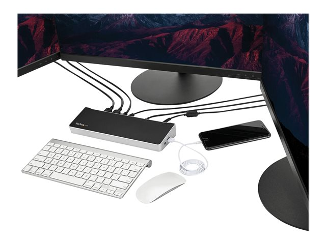 Cette station d'accueil triple-4K pour les ordinateurs portables USB-C Mac, Windows et Chrome fait passer la productivité à la vitesse supérieure. Avec trois connexions vidéo 4K, Power Delivery 100 W et 5 ports USB 3.0, la station d'accueil USB-C est parfaite pour votre MacBook, Dell XPS, Chromebook ou tout autre ordinateur portable USB-C nécessitant des ports supplémentaires. Vous pouvez également connecter la station d'accueil à votre ordinateur portable USB 3.0 à l'aide d'un port USB-A et d'un câble USB-C vers USB-A, tel que le "USB315AC1M" (vendu séparément). Remarque : la charge de votre ordinateur portable par Power Delivery n'est pas disponible par USB-A et seul le double affichage est pris en charge.
