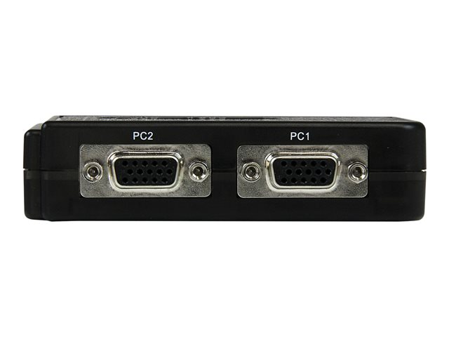 Le kit commutateur KVM USB noir 2 ports avec audio et câbles vous permet de commander deux ordinateurs dotés de ports USB à l'aide d'un seul ensemble clavier, souris et moniteur VGA ; il permet également le fonctionnement à touche directe et à bouton poussoir du panneau supérieur pour basculer entre les écrans connectés. Conçu pour une intégration parfaite dans tous les environnements, le commutateur KVM USB offre une conception compacte (environ la taille d'un jeu de cartes) ; il est alimenté par les ordinateurs auxquels il est connecté, supprimant ainsi la nécessité d'une alimentation externe. Le commutateur KVM USB est une solution idéale pour quasiment toutes les applications, il prend en charge des résolutions vidéo d'au plus 2048 x 1536 ainsi que la commutation audio. Le commutateur KVM USB inclut deux câbles hôtes 1,22 m VGA 2-en-un et USB, pour une installation rapide ; il offre une solution KVM prête à l'emploi. Le commutateur KVM permet un contrôle pratique et fiable de plusieurs ordinateurs à partir d'une seule station périphérique, il est accompagné d'une garantie StarTech.com de 2-ans et d'une assistance technique gratuite à vie.